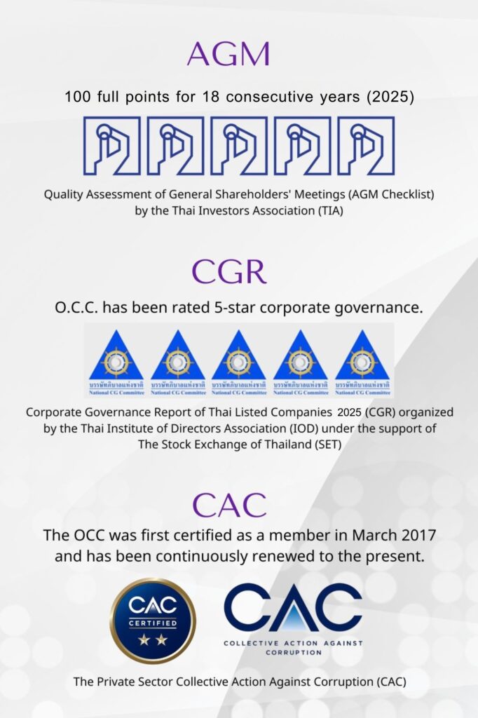 O.C.C. received a 5-star corporate governance rating in the Corporate Governance Report of Thai Listed Companies 2025 (CGR) project organized by the Thai Institute of Directors Association (IOD) with the support of The Stock Exchange of Thailand (SET), reflecting the importance of good corporate governance under the principles of corporate governance, vision, and sustainable management, taking into account the role of stakeholders and treating shareholders equally.