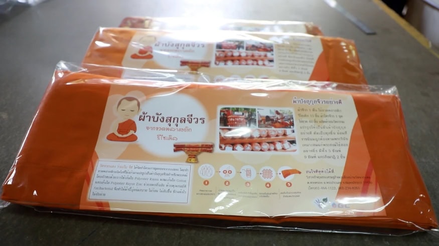 จาก นัชชา ปรักกัมนนท์ ผู้จัดการแผนกโฆษณา-ประชาสัมพันธ์ พร้อมทีมงาน CSR บริษัท โอซีซี จำกัด (มหาชน) เพื่อนำไปเข้าสู่กระบวนการรีไซเคิล แปรรูปเป็นเส้นใย และถักทอตัดเย็บเป็น “ผ้าไตรจีวร” สำหรับพระภิกษุสงฆ์
