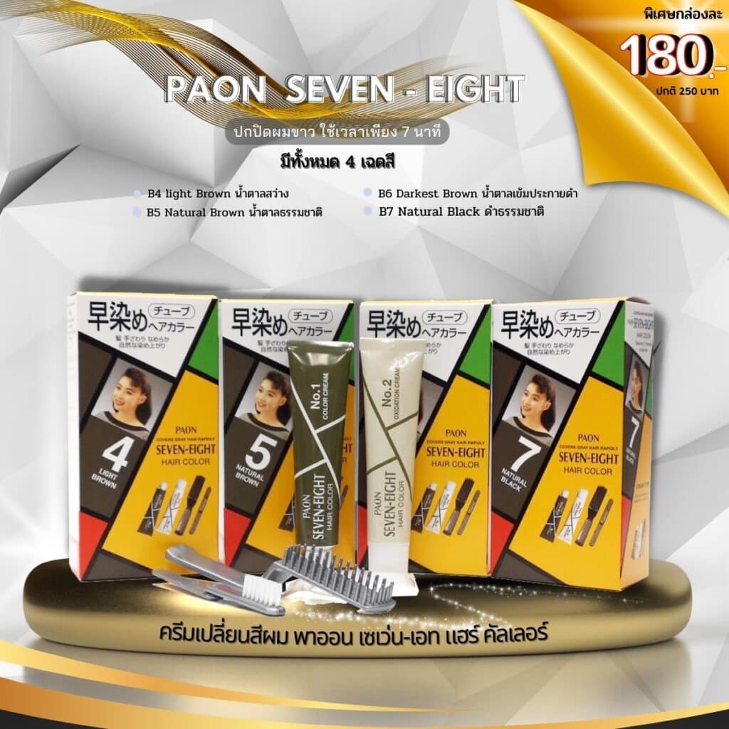 PAON SEVEN-EIGHT HAIR COLOR (พาออน เซเว่น-เอท แฮร์ คัลเลอร์) ครีมเปลี่ยนสีผมสำหรับปิดผมขาว เทคโนโลยีจากประเทศญี่ปุ่น ปิดผมขาวได้เนียนสนิทแค่ 7 นาที ไม่มีสารแอมโมเนีย ไม่มีกลิ่นฉุน ไม่ทำร้ายเส้นผม และอ่อนโยนต่อหนังศีรษะ ลดราคาพิเศษ ส่งท้ายซัมเมอร์ เหลือเพียงกล่องละ 180 บาท(จากปกติ 250 บาท) ตั้งแต่วันนี้ – 31 พฤษภาคม 2566 ดูข้อมูลและสั่งซื้อสินค้าได้ที่ FACEBOOK: PAON Seven-Eight -Thailand